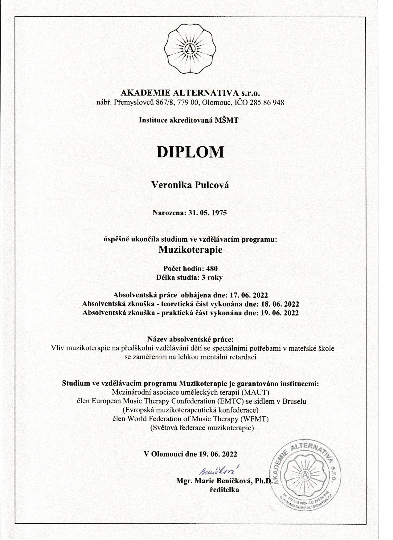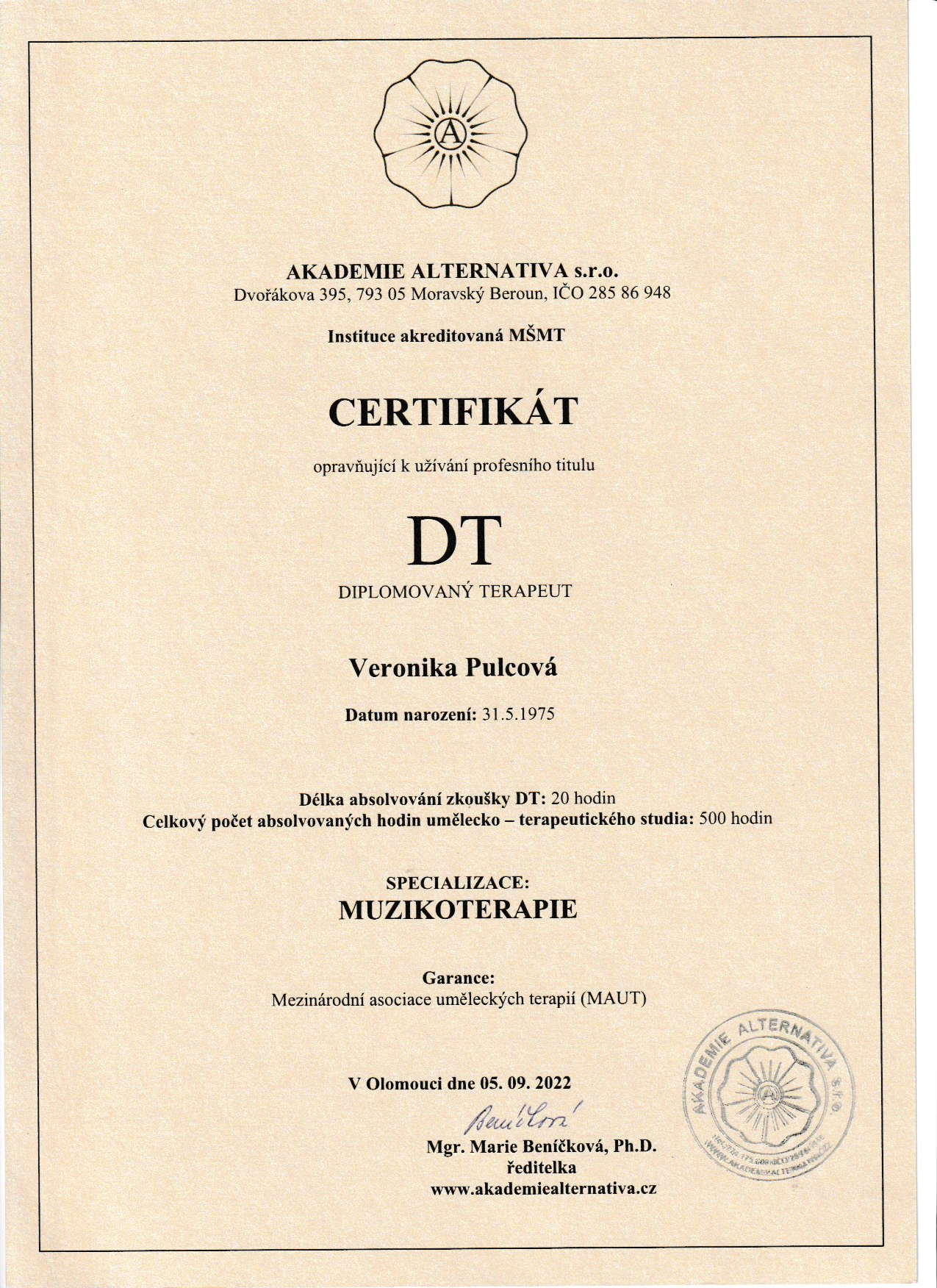 Jsem absolventkou studia Muzikoterapie na Akademii Alternativa, kde jsem získala profesní titul DT – diplomovaný terapeut s garancí Mezinárodní asociace uměleckých terapií (MAUT).